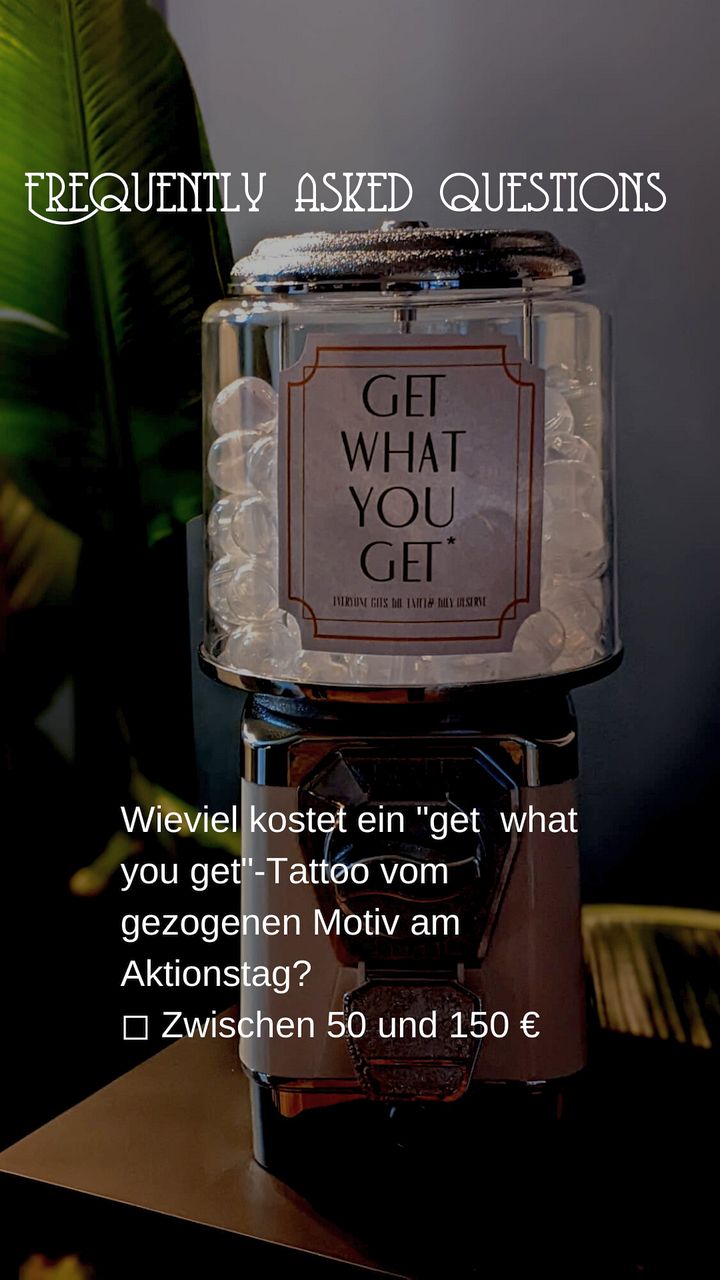 Am 26. Februar 2022 startete unser erster „Get what you get-Tag“. In unserem Warenautomat konnte man sich für einen Euro eine Kapsel mit einem kleinen Flash (Tattoomotiv) ziehen. Gefiel es, konnte man es sich ohne Termin für den halben Preis vor Ort stechen lassen. Jede(r) hatte 3 Versuche. Dank eurer großartigen Resonanz werden auch dieses Jahr wieder solche Aktionstage und Walk-In-Days stattfinden.