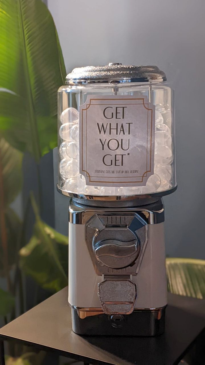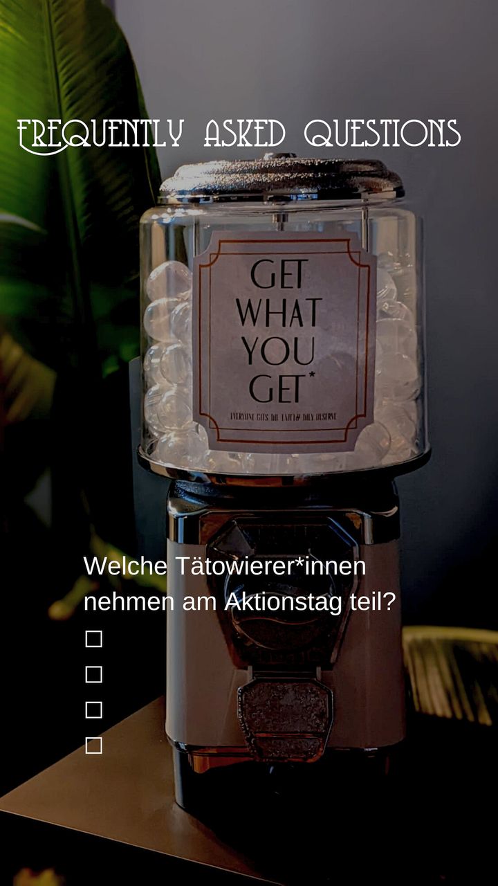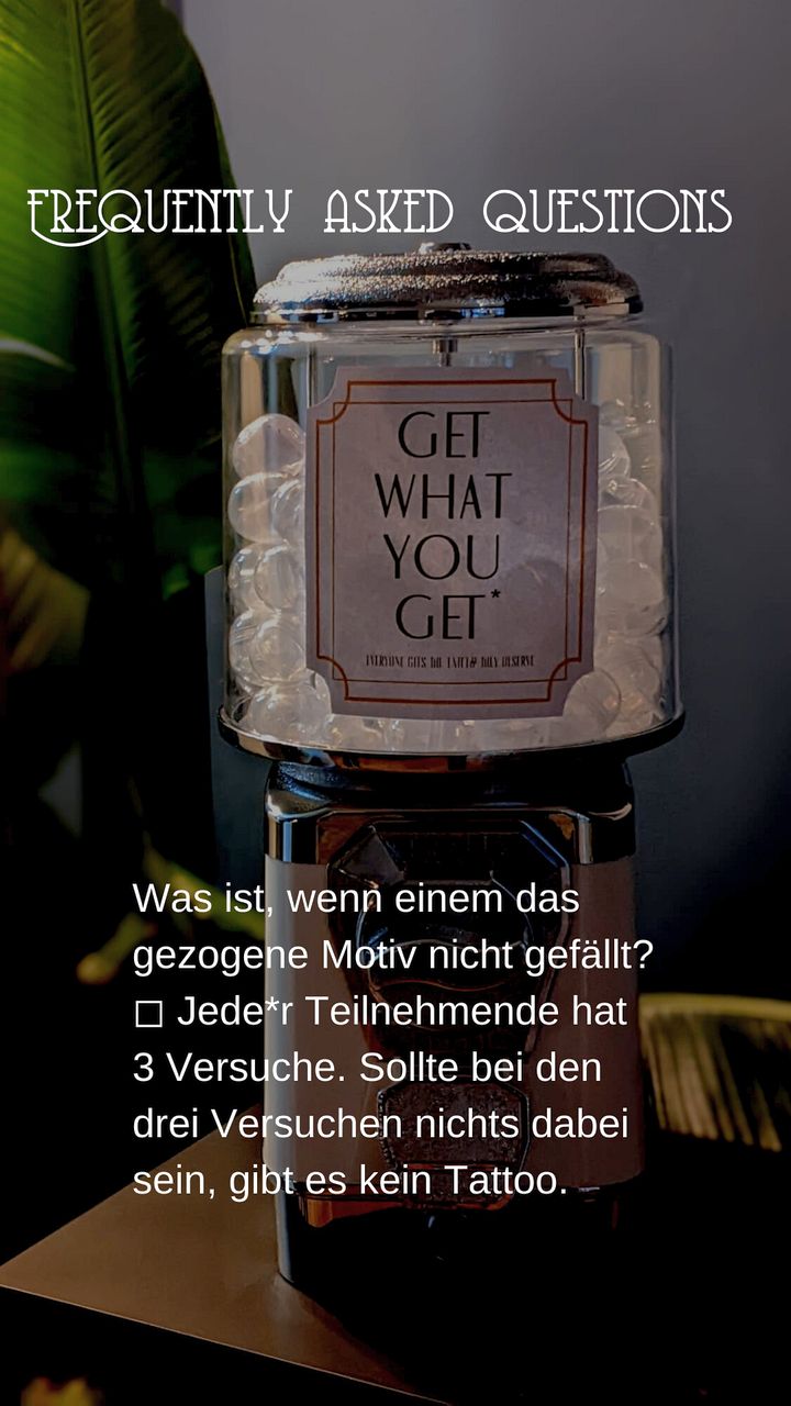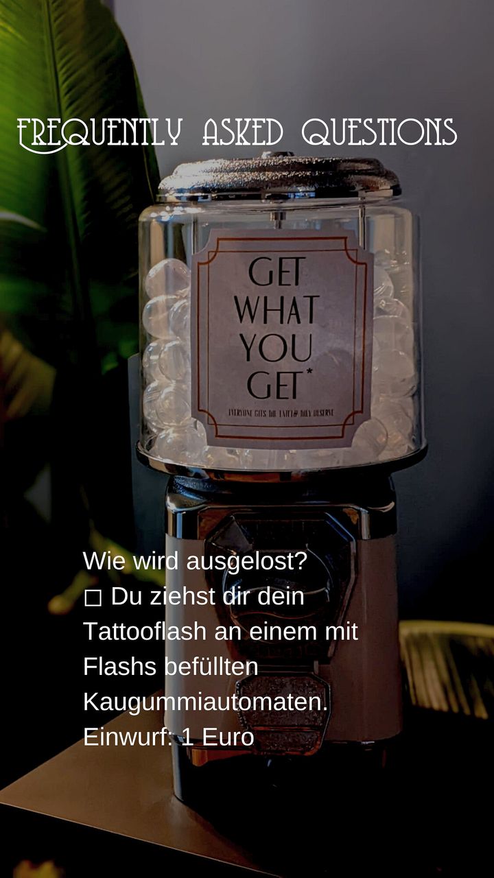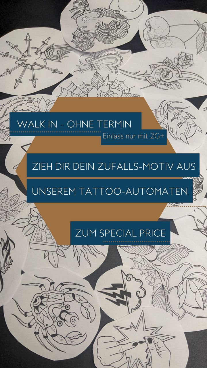 Am 26. Februar 2022 startete unser erster „Get what you get-Tag“. In unserem Warenautomat konnte man sich für einen Euro eine Kapsel mit einem kleinen Flash (Tattoomotiv) ziehen. Gefiel es, konnte man es sich ohne Termin für den halben Preis vor Ort stechen lassen. Jede(r) hatte 3 Versuche. Dank eurer großartigen Resonanz werden auch dieses Jahr wieder solche Aktionstage und Walk-In-Days stattfinden.
